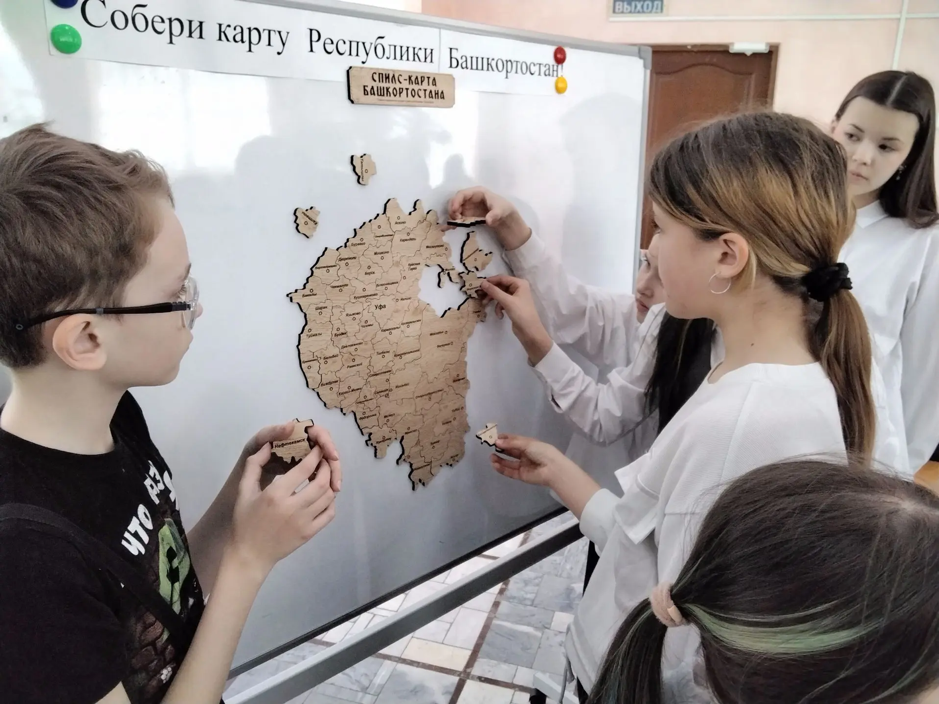 С большим интересом школьники собирали из деревянных пазлов карту Башкортостана.