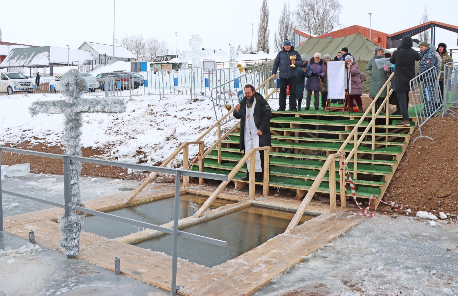 Все необходимые условия для крещенских купаний были созданы: на берегу установили палатку для переодевания, дорожку от раздевалки до купели и ступени к иордани закрыли ковролином, всю зону для купаний обнесли специальными ограждениями, а рядом была установлена табличка «Осторожно! Тонкий лёд!».